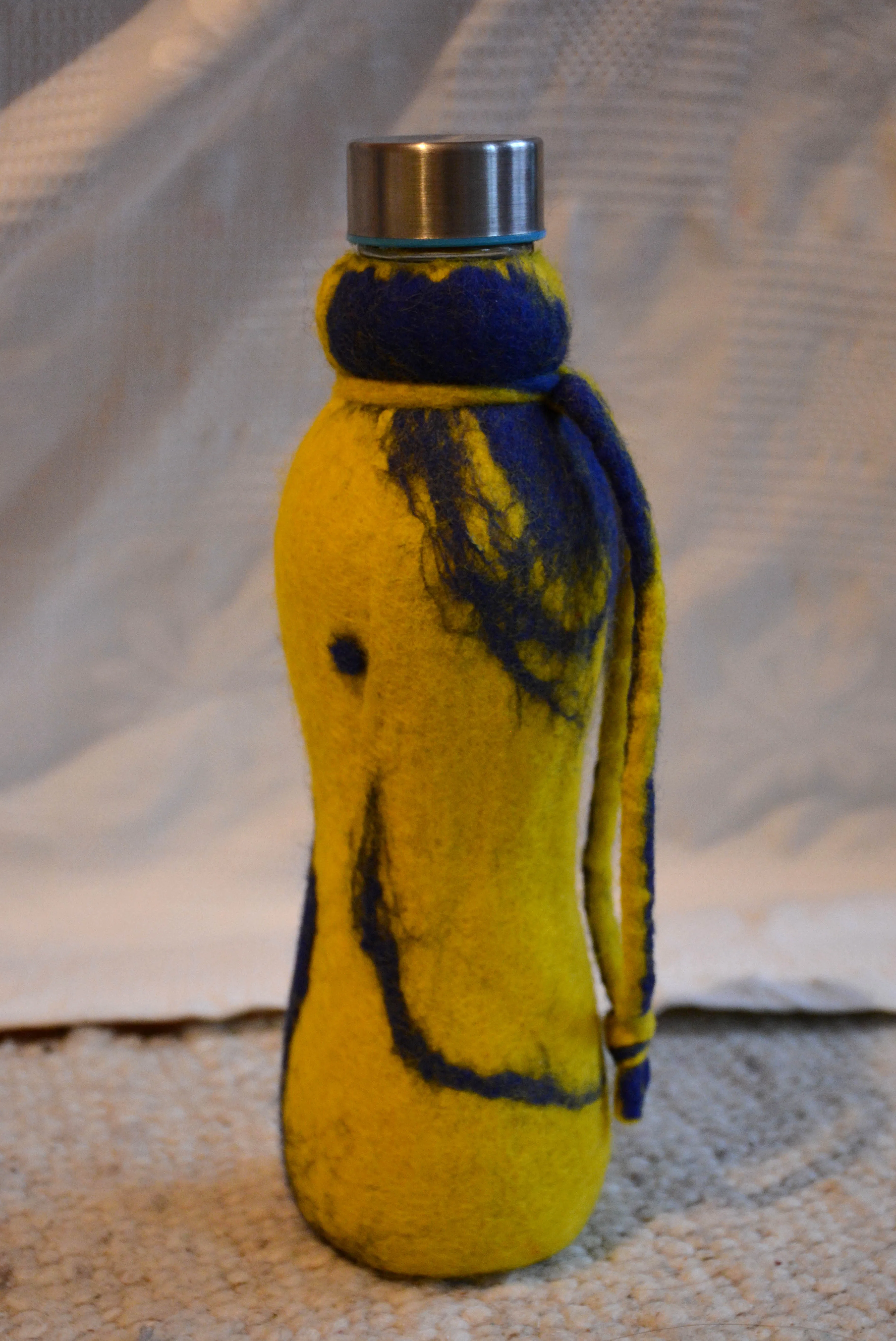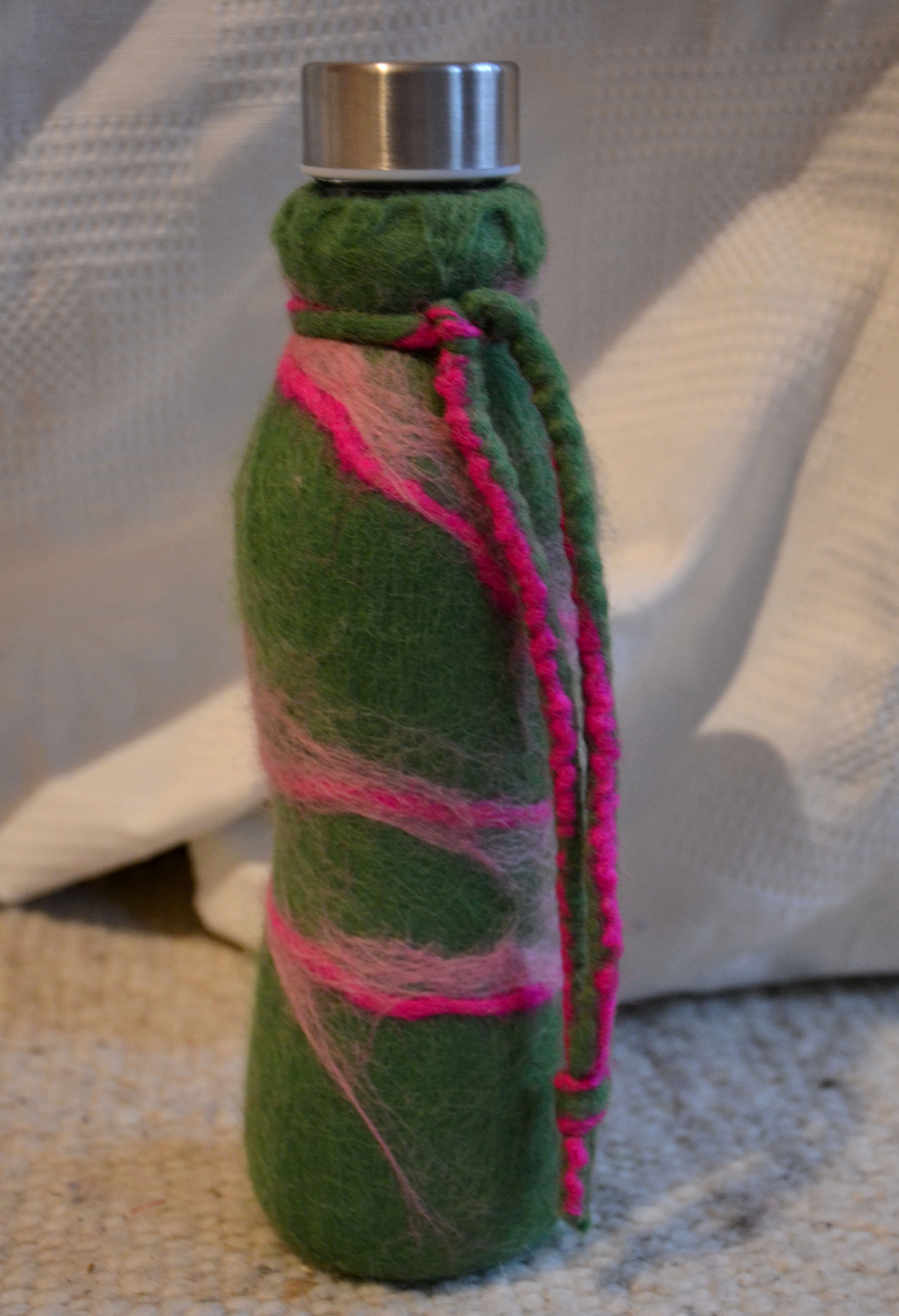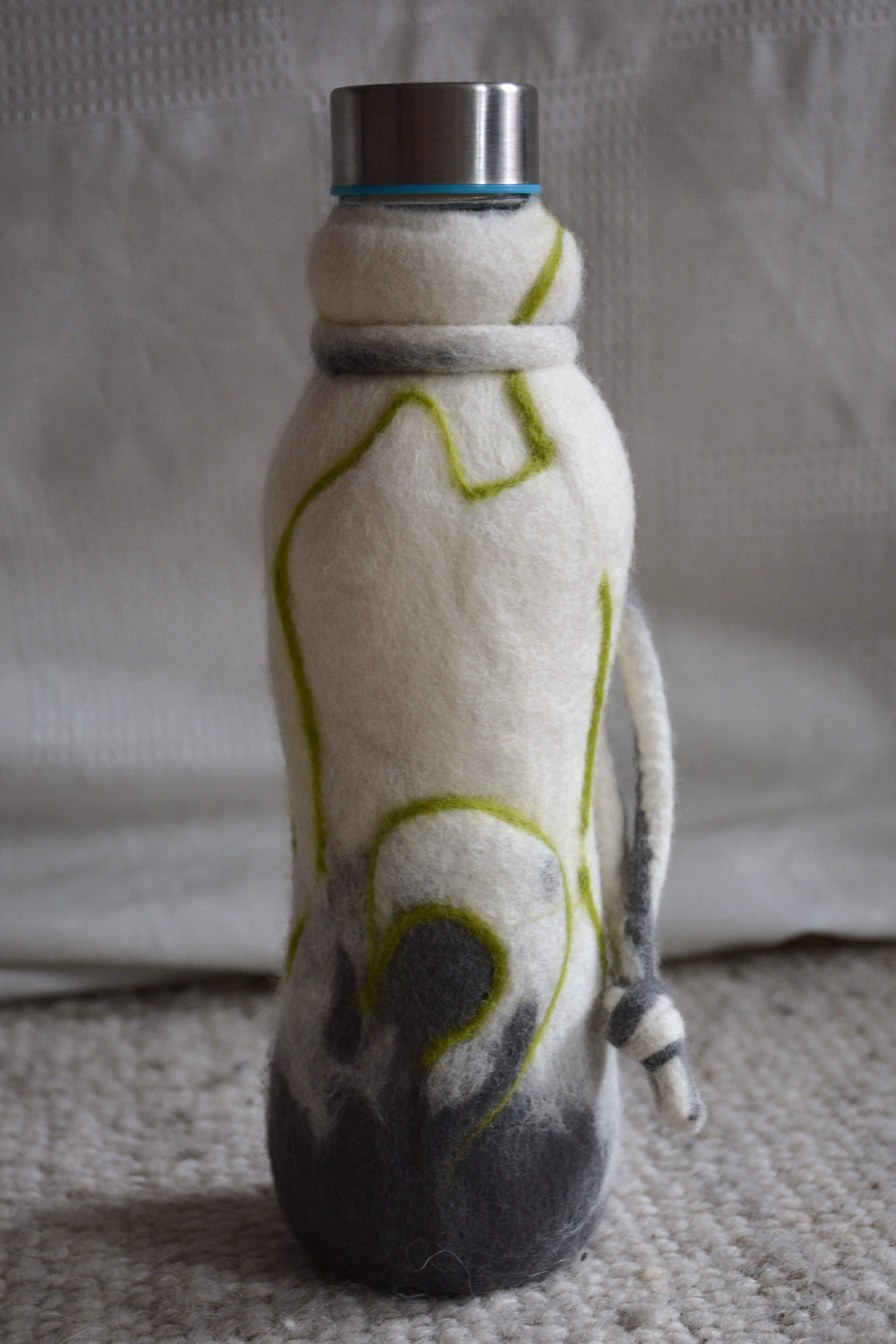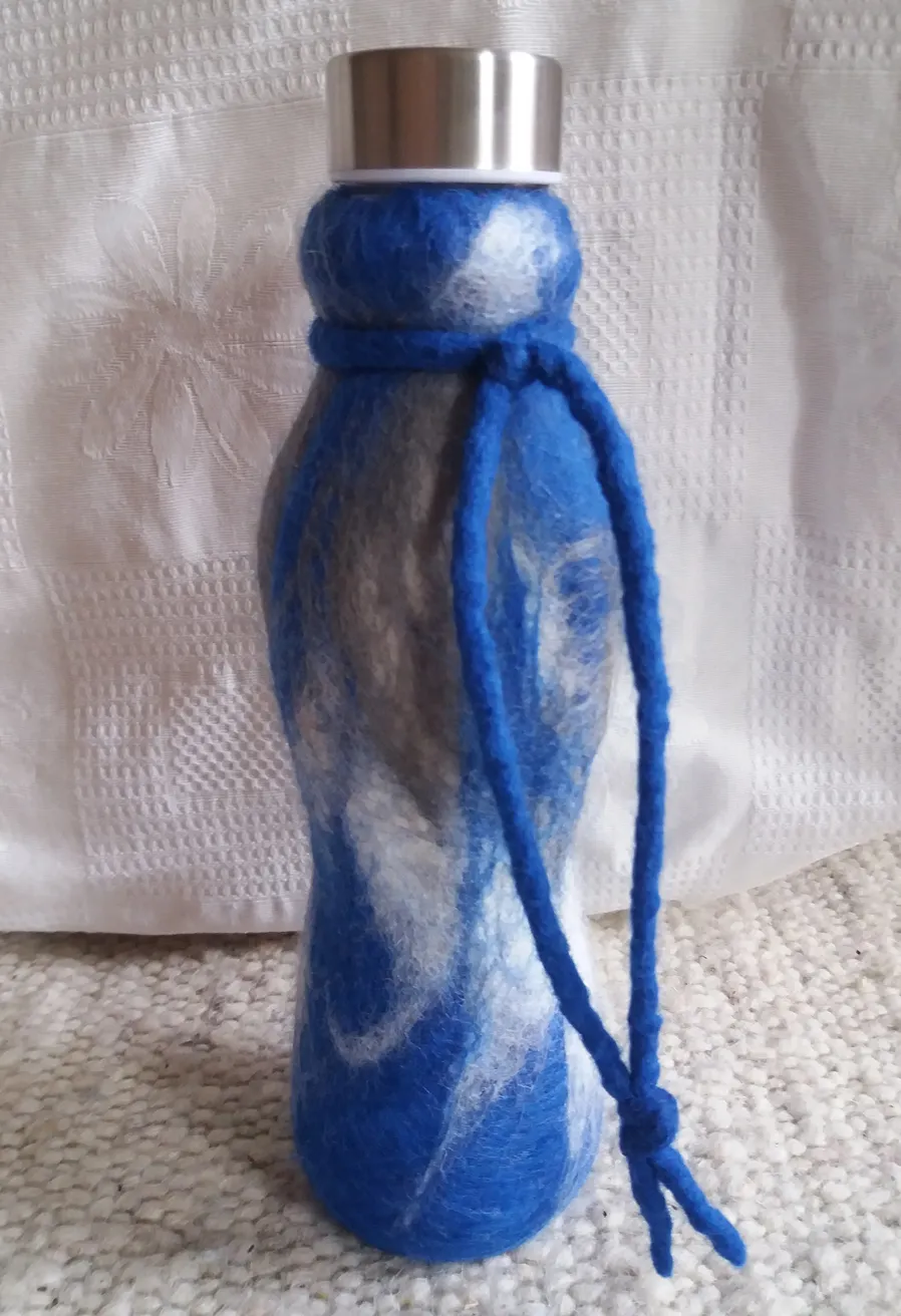Glasflaschen umfilzt, eine gesunde Alternative zu Plastikflaschen. Der Filz isoliert und macht das Glas relativ bruchsicher.