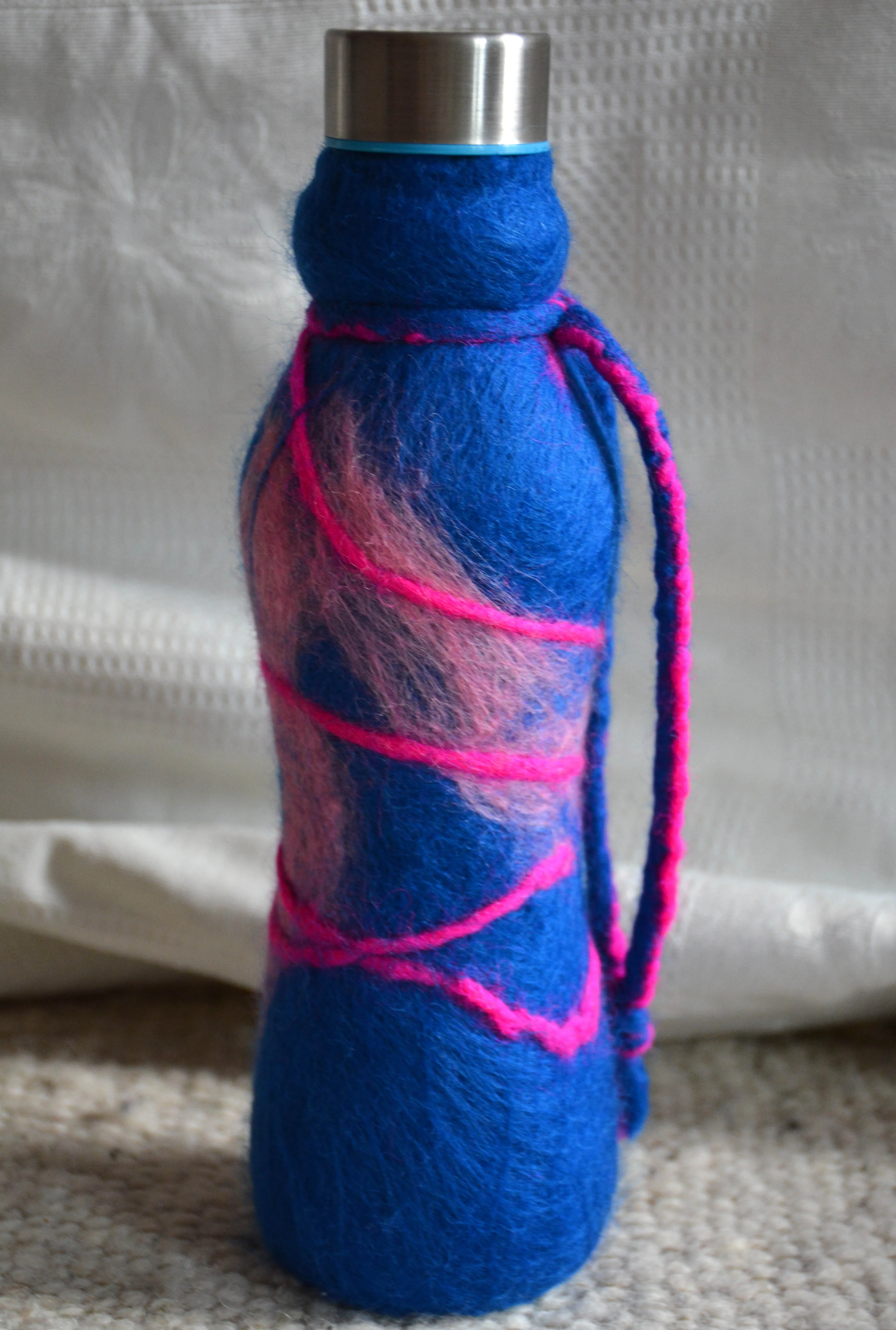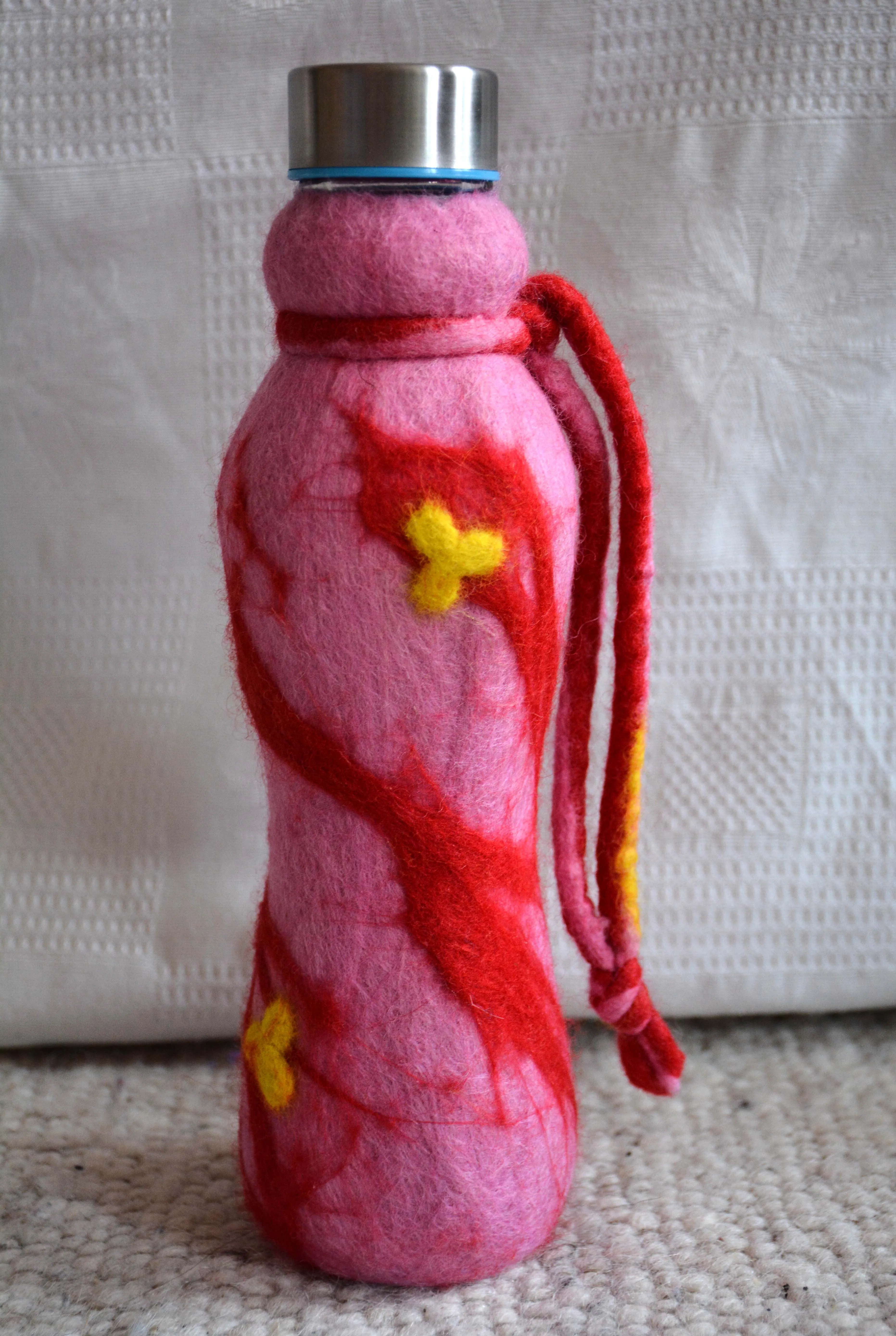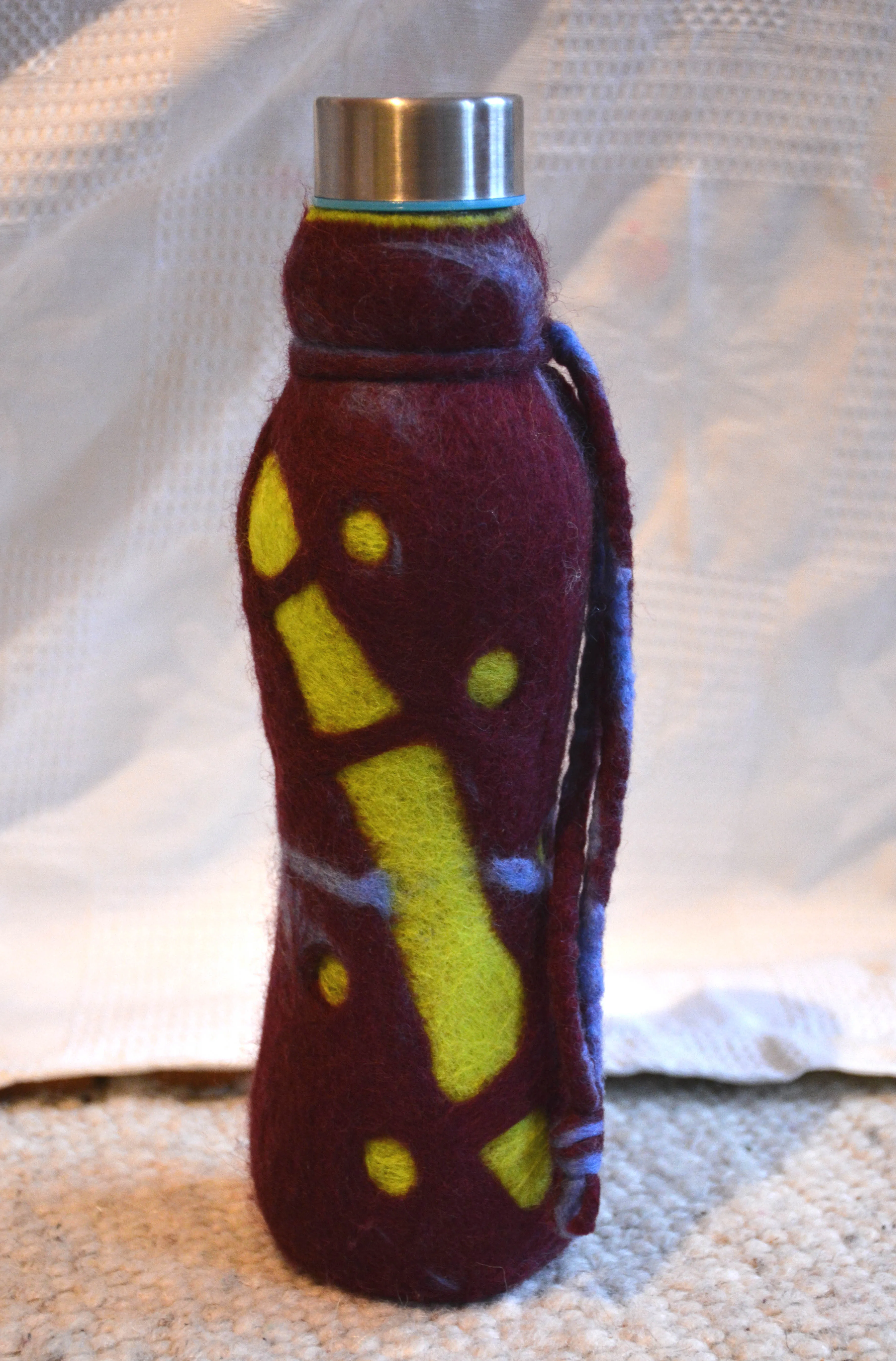 Glasflaschen umfilzt, eine gesunde Alternative zu Plastikflaschen. Der Filz isoliert und macht das Glas relativ bruchsicher.